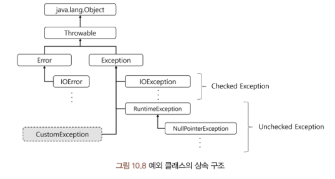 에러(error) : 에러는 주로 자바의 가상머신에서 발생시키는 것으로 예외와 달리 애플리케이션에서 코드로 처리할 수 있는 것이 거의 없다. 대표적인 예로 메모리부족(OutOfMemory), 스택 오버플로(StackOverFlow)등이 있다. 에러는 발생 시점에 처리하는 것이 아닌 미리 애플리케이션의 코드를 살펴보면서 문제가 발생하지 않도록 예방해서 원천적으로 차단해야 한다.