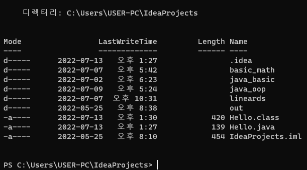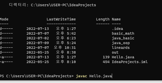 다시 해당 경로를 ls 명령어를 통해 확인 해보면 이전에는 없던 Hello.class가 생성이 된 걸 볼 수 있다.